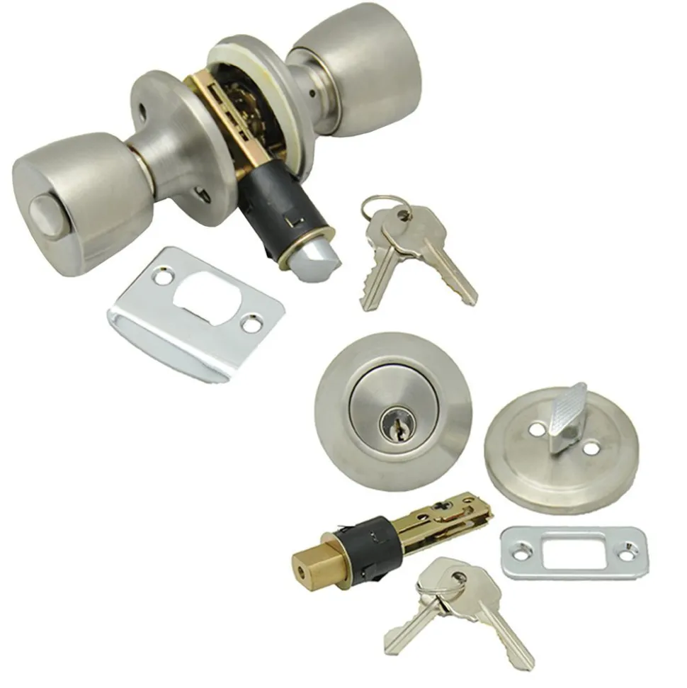 Combo Lock Set with knob lock and dead bolt. Combo Lock Set offers both a Knob and a Dead Bolt Lock with matching keys. Includes keys and hardware. Stainless Steel