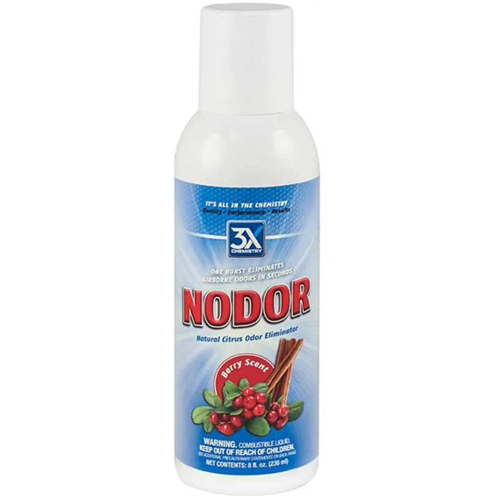 Non-aerosol natural odor eliminator. Berry Scent is great for eliminating foul odors with just one NODOR spray ? even skunk odor! NODOR eliminates odors caused by: animals and pets, cooking, mold and mildew, tobacco smoke, trash containers, urine, vomit and more! Comes in an 8 oz. pump spray can.